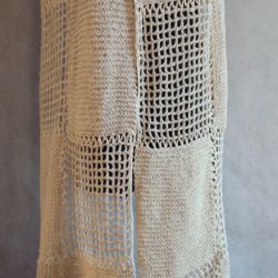 Szal jest wykonany na drutach i szydełkiem z akrylu z dodatkiem lnu. Szal jest długi i miękki, ażurowe i pełne kwadraty sprawiają, że mimo wielkości szala nie jest on bardzo obfity