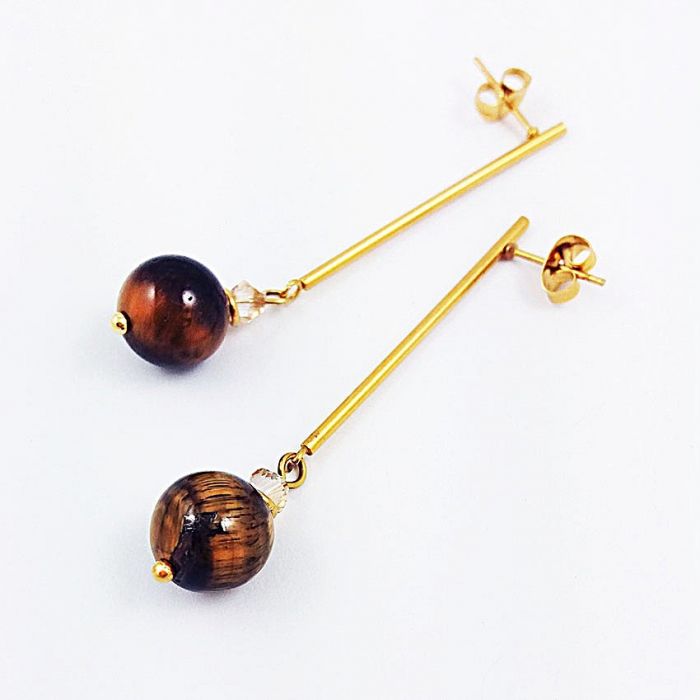 Długie, eleganckie kolczyki z nieuczulającej, pozłacanej stali szlachetnej. Na sztyftach, patyczkach zawieszone są gładkie kule z tygrysiego oka, pięknie błyszczące w świetle, w kolorze brązowo złotym, o średnicy 10mm i malutkie kryształki, o średnicy 4mm w kolorze beżowym. Całkowita długość kolczyków-5cm.
