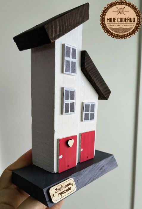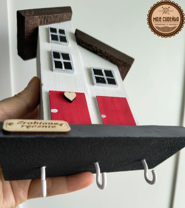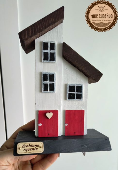 Wieszak z domkami 3D wykonany z drewna sosnowego, mogący służyć jako wieszak na klucze, ręczniki oraz inne drobiazgi. Drewno pełnowartościowe, malowane farbami akrylowymi. Drewniane, wycinane okna i drzwi, oraz inne detale nadające całości niepowtarzalną kompozycję. Propozycja nietuzinkowego prezentu jak również oryginalna ozdoba każdego wnętrza. Długość 14 cm, wysokość (mierzona w najwyższym punkcie) 21 cm, grubość 7 cm . Całość do zawieszenia na ścianie na 1 haczyku.