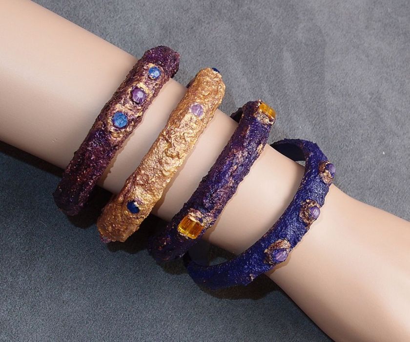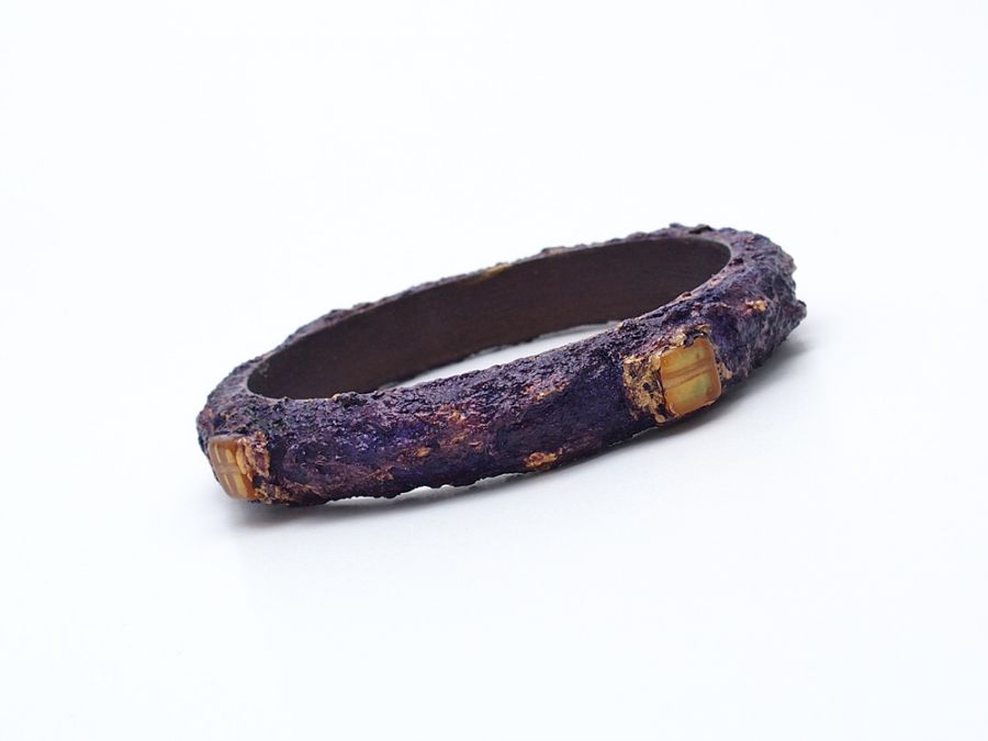 Zapraszam do zakupu drewnianej bransoletki w kolorze fioletu i złota. Pokryta jest pastą strukturalną, malowana farbami akrylowymi i ozdobiona szklanym koralikiem. Jest lekka.