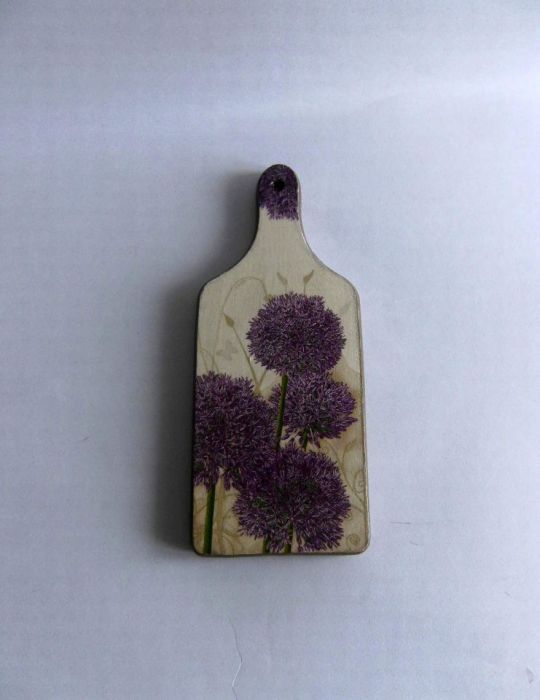 Drewniana deseczka pomalowana farbami akrylowymi.Motyw ozdobny- kwiat cebuli przyklejony z serwetki.Deseczka dekorowana i lakierowana jednostronnie kilkoma warstwami ekologicznego lakieru.Nadaje się do mycia bez długotrwałego moczenia.
