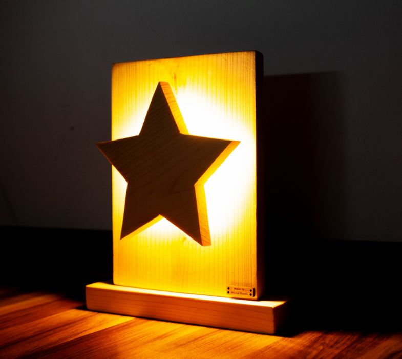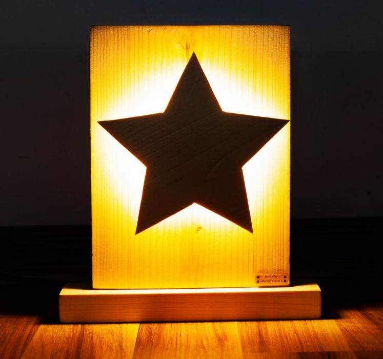 Drewniana lampa nocna wykonana ręcznie. Symbol gwiazdy, do wyboru drewno surowe lub opalane. Idealne do sypialni jako lampa nocna, do salonu jako lampa nadająca przyjemny klimat lub jako prezent. Barwa światła to biały ciepły.