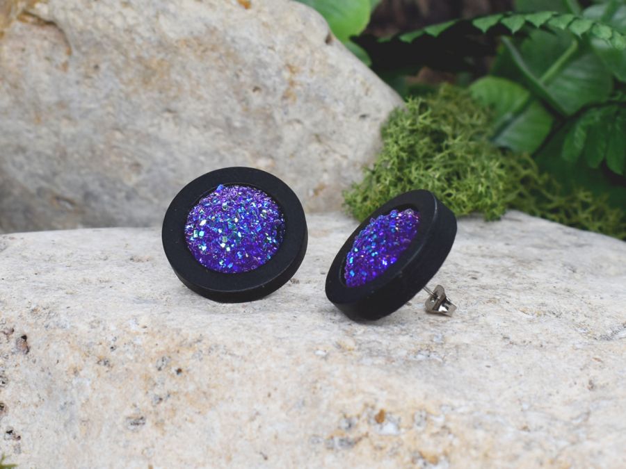 Ręcznie wykonane kolczyki z drewna barwionego na czarno ozdobione druzami. Idealne do letnich kolorowych stylizacji boho / hippie.