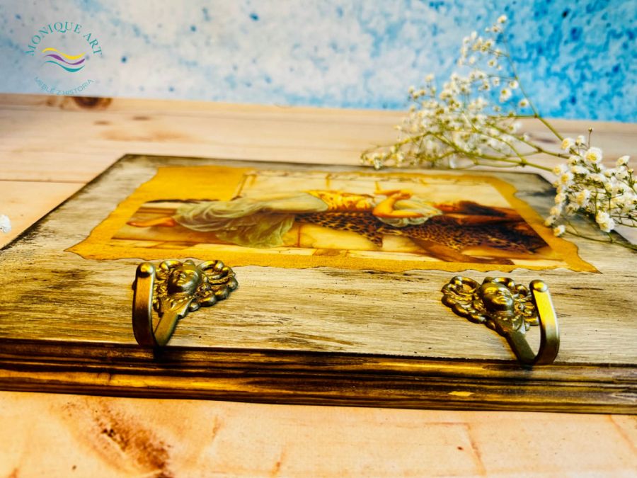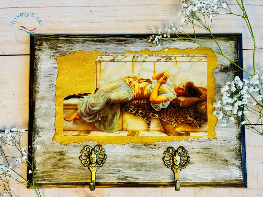 Drewniany wieszak w stylu shabby chic ozdobiony motywem kobiety