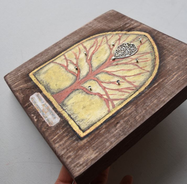 Obraz - abstrakcyjne drzewo - wykonany w technice mieszanej na kawałku deski sosnowej (częściowo bejcowanej, białe tło i drzewo malowane farbami akrylowymi). W projekcie wykorzystany jest również element starej biżuterii oraz gwoździe.