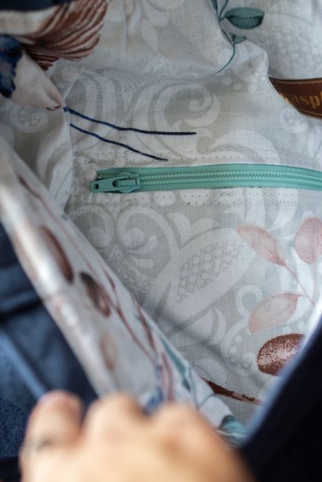 Torebka posiada bawełnianą podszewkę w kwiaty, a w środku kieszeń zapinaną na suwak. Z tyłu torby znajduje się dodatkowa kieszonka zapinana na suwak.