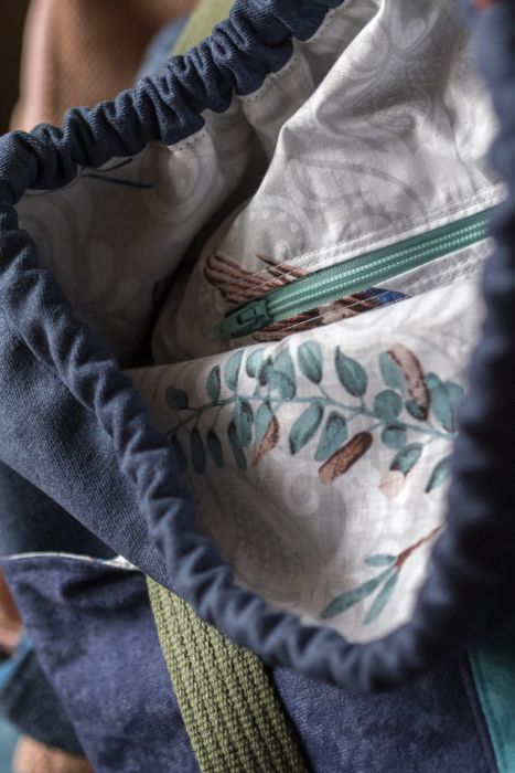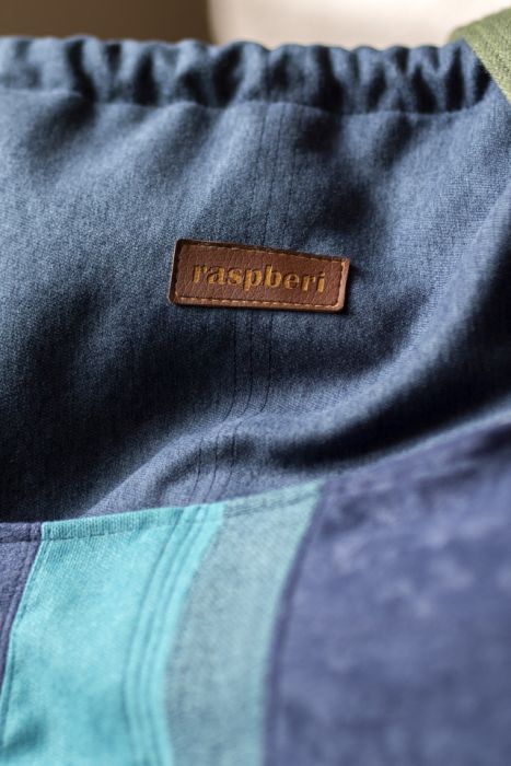 Wykonana z tkaniny w kolorze granatowym, z przodu dwie kieszenie z kilku rodzajów kolorowych tkanin. Bawełniane, oliwkowe pasy i jasna, bawełniana podszewka w kwiaty.