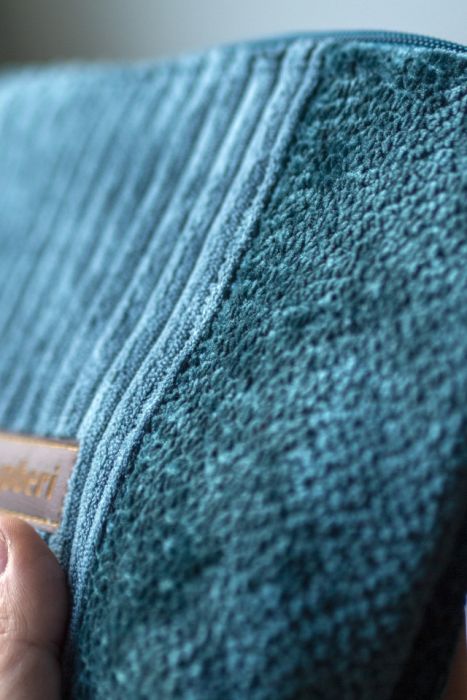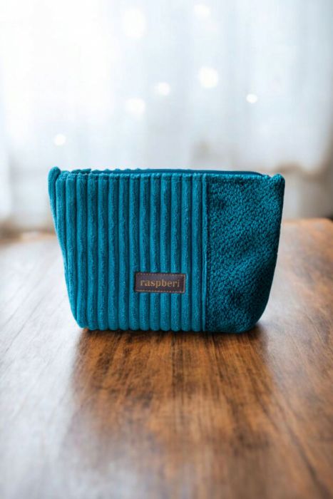 Duża kosmetyczka w kolorze turkusowym. Bardzo przyjemna w dotyku. Wykonana w duchu no waste.