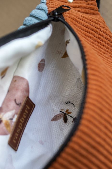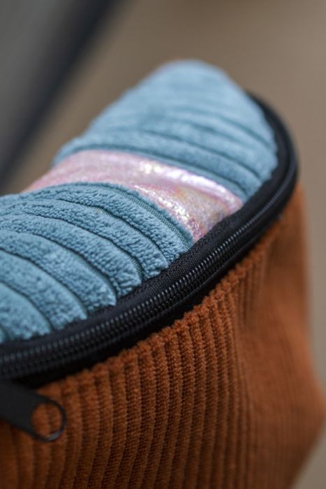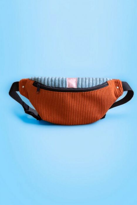 Duża nerka saszetka biodrowa wykonana z pomarańczowego sztruksu, rudej plecionki i niebieskiego grubego sztruksu. Na klapie wstawka z błyszczącej różowej taśmy.