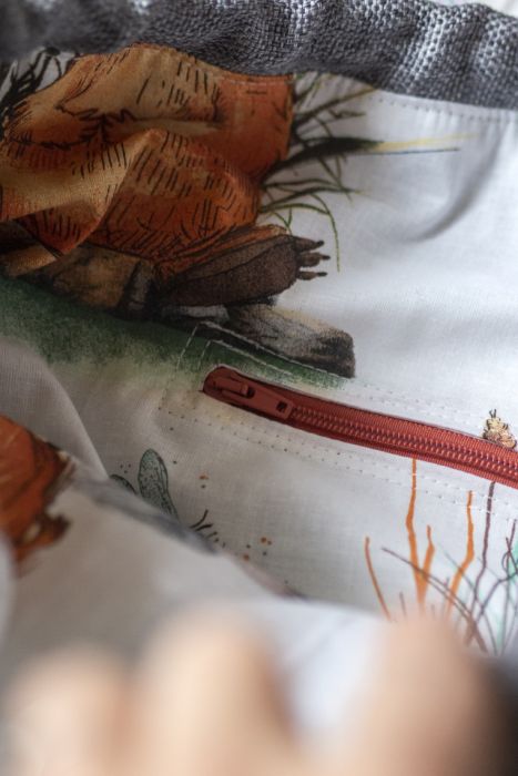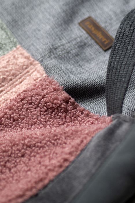 Wykonana z tkaniny w kolorze szarym. Z przodu dwie kieszenie z kilku rodzajów tkanin w odcieniach szarości i różu. Bawełniane, grafitowe pasy i biała, bawełniana podszewka w kapibary.