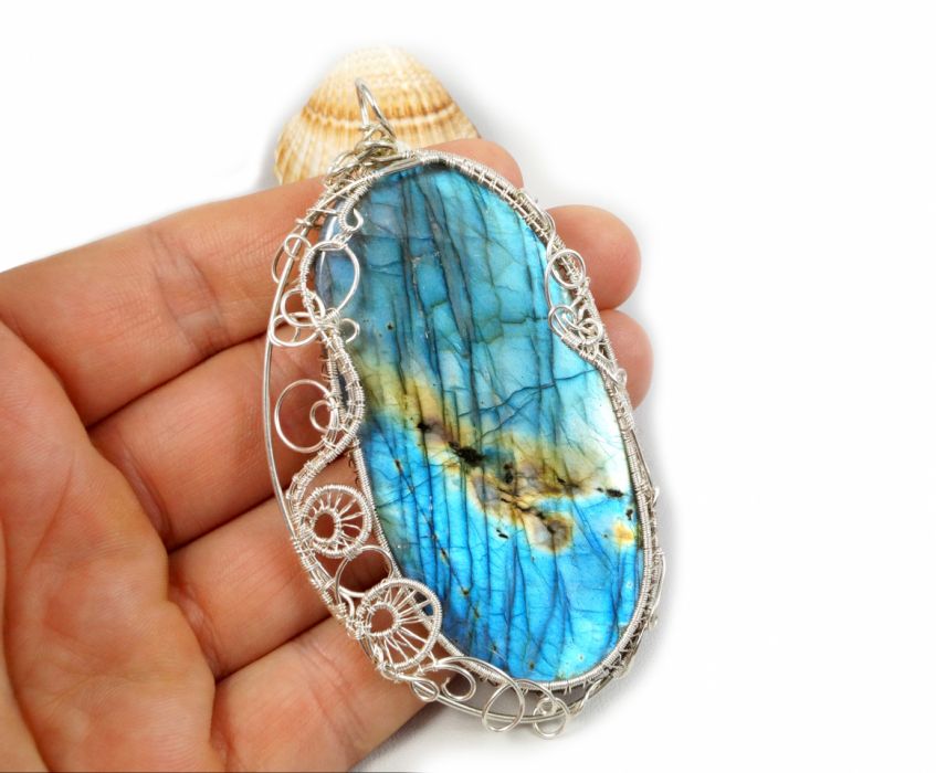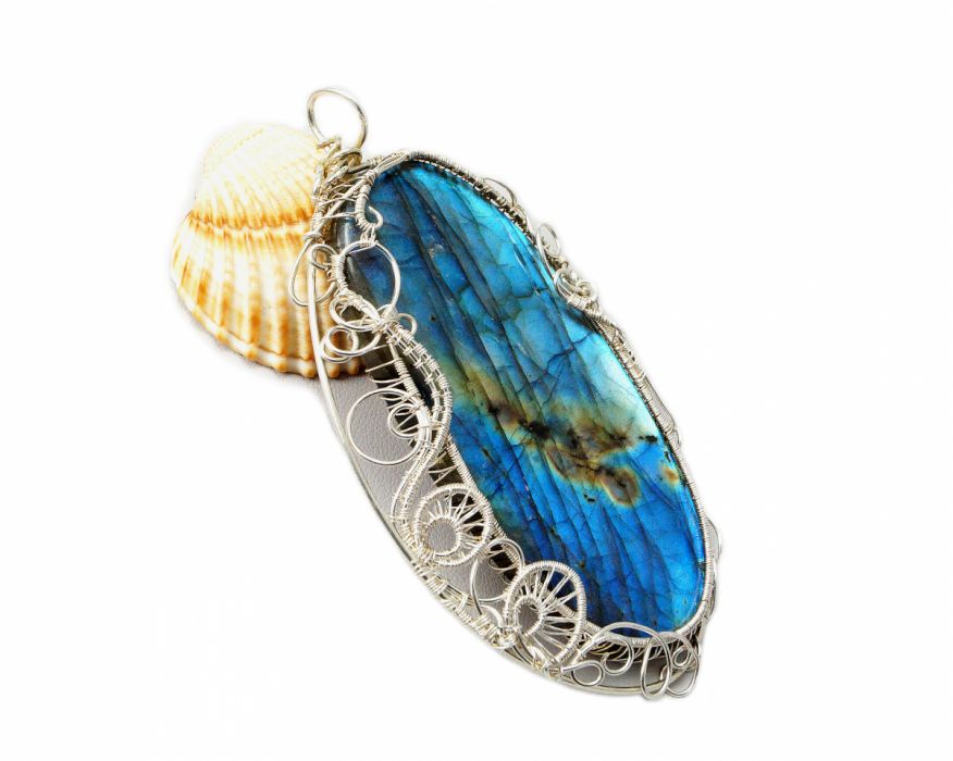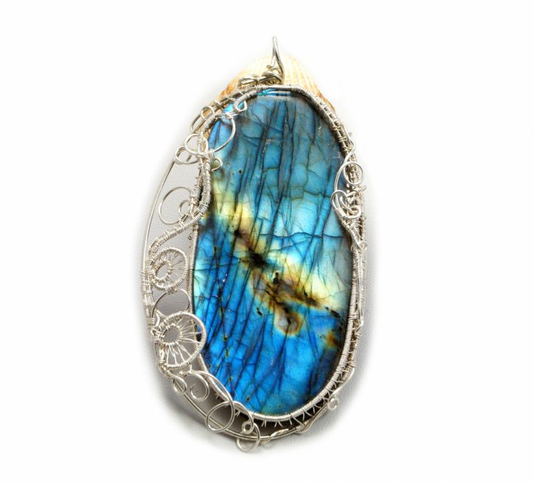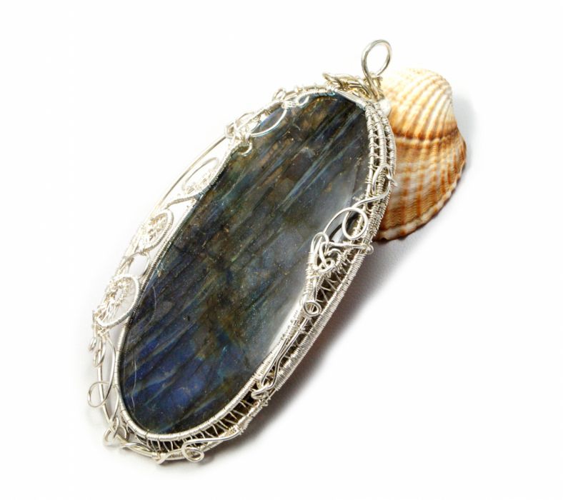 Niepowtarzalny, duży, misternie pleciony wisior z niebiesko pomarańczowym kaboszonem labradorytu. Wisior zaprojektowany i wykonany przeze mnie od podstaw bardzo pracochłonną i precyzyjną techniką wire-wrapping z najwyższej próby srebra 999 oraz z 930, 925.