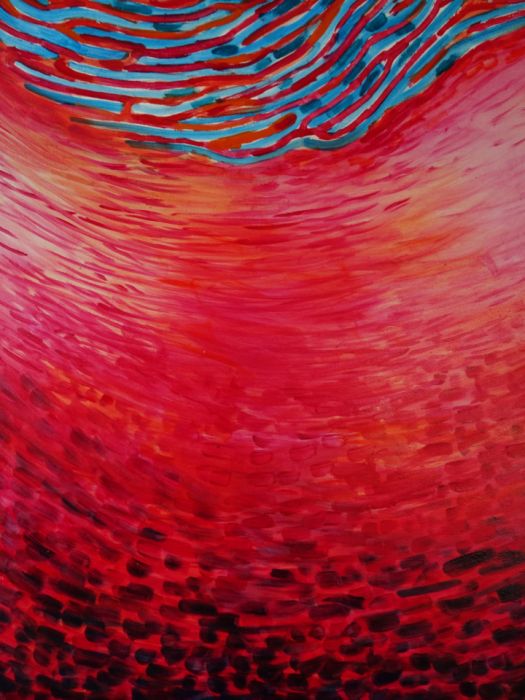Na obrazie widzimy wirujące, kolorowe esy-floresy, które przyciągają wzrok niczym magiczny wir. Dominują tutaj odcienie różu i niebieskiego, tworząc dynamiczną kompozycję pełną ruchu. Artysta użył kontrastujących kolorów, by nadać energii i życia temu dziełu. Kształty przypominają nieco wirujące fale, przywołując na myśl oceaniczne głębiny. Atmosfera obrazu jest intensywna, pełna ruchu i żywiołowości, jakby miała wybuchnąć w każdej chwili. Styl jest z pewnością abstrakcyjny, z elementami ekspresjonizmu, gdzie szerokie pociągnięcia pędzla i płynne linie dodają dynamiki.