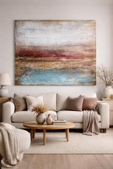 Wyjątkowy, ręcznie wykonany obraz abstrakcyjny, który wnosi do wnętrza elegancję, światło i poczucie luksusu.