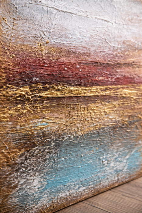 Bogata faktura oraz subtelne przejścia kolorystyczne w odcieniach złota, bieli, bordo i turkusu tworzą kompozycję inspirowaną linią horyzontu o zachodzie słońca.
