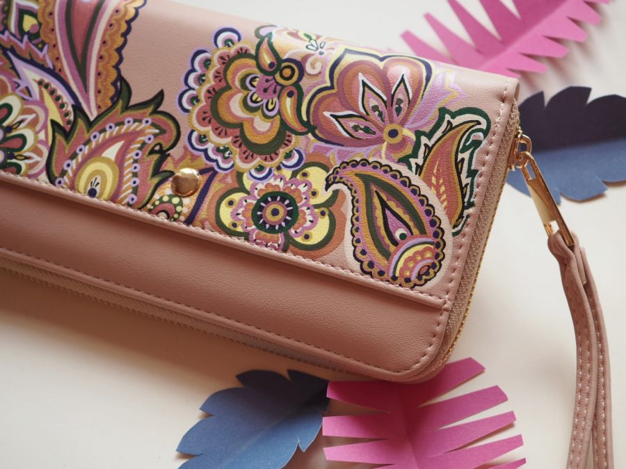 Beżowy portfel ze sztucznej skóry, zapinany na suwak, ozdobiony ręcznie malowanym wzorem paisley.