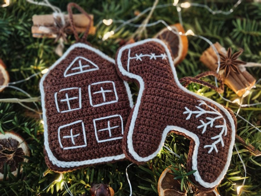 Dwa szydełkowe pierniczki w kształcie konika i domku to wyjątkowa ozdoba Twojej choinki lub nietuzinkowy świąteczny prezent i pamiątka na lata.