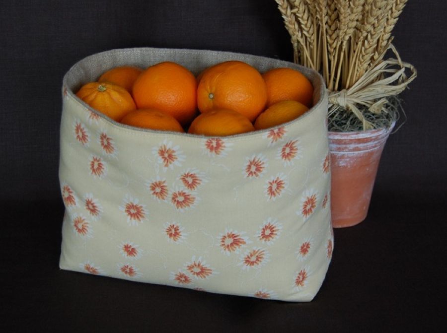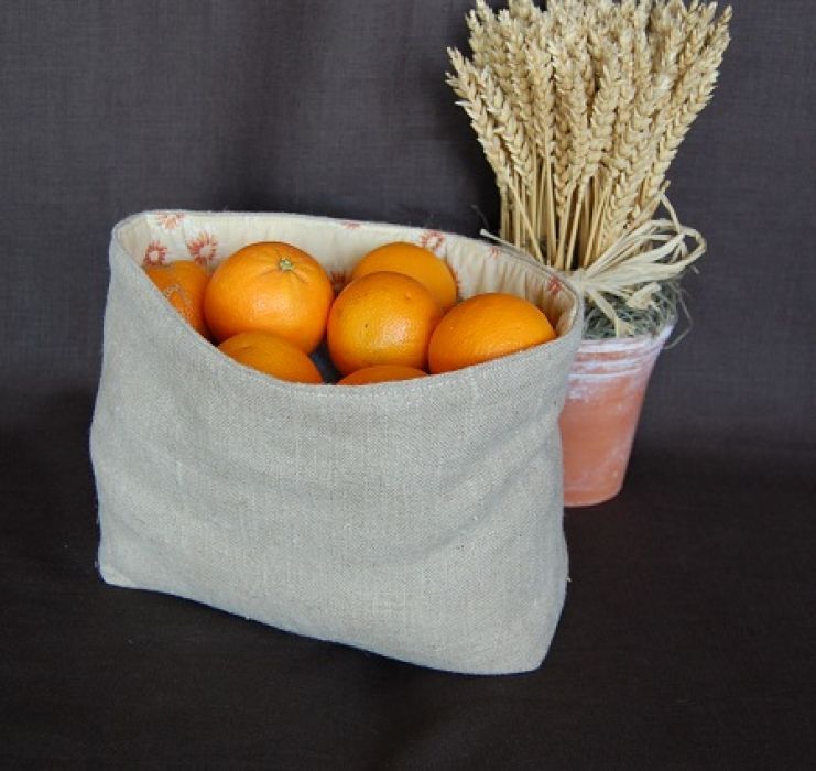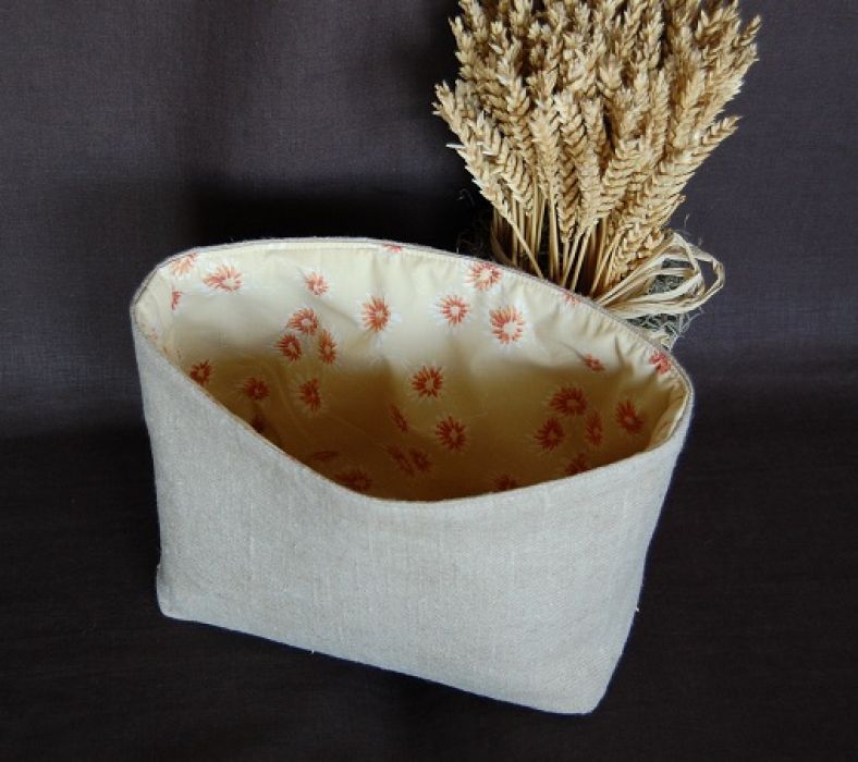 Dwustronny woreczko - koszyczek wykonany z jednej strony z naturalnego lnu, z drugiej z kwiecistej bawełny. Staranne wykończenie pozwala na obustronne używanie koszyczka. Usztywniony warstwą ociepliny. Koszyczek utrzymany w rustykalnej stylistyce.
