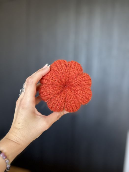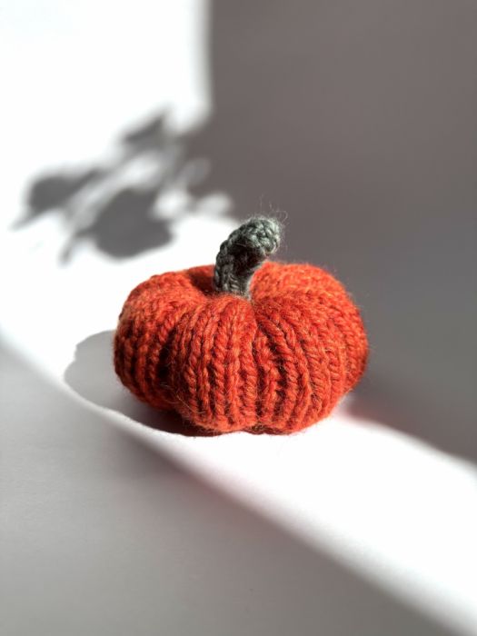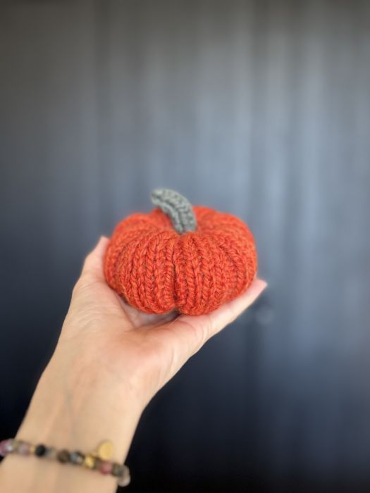 Ręcznie robiona na drutach dynia, wykonana z mieszanki naturalnych włóczek.