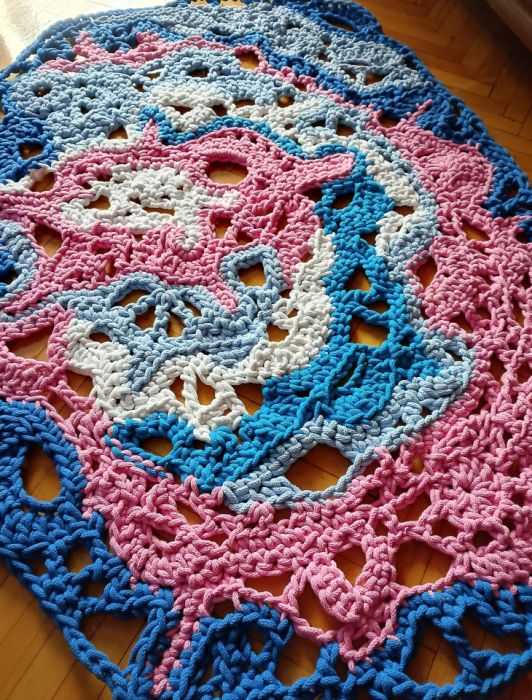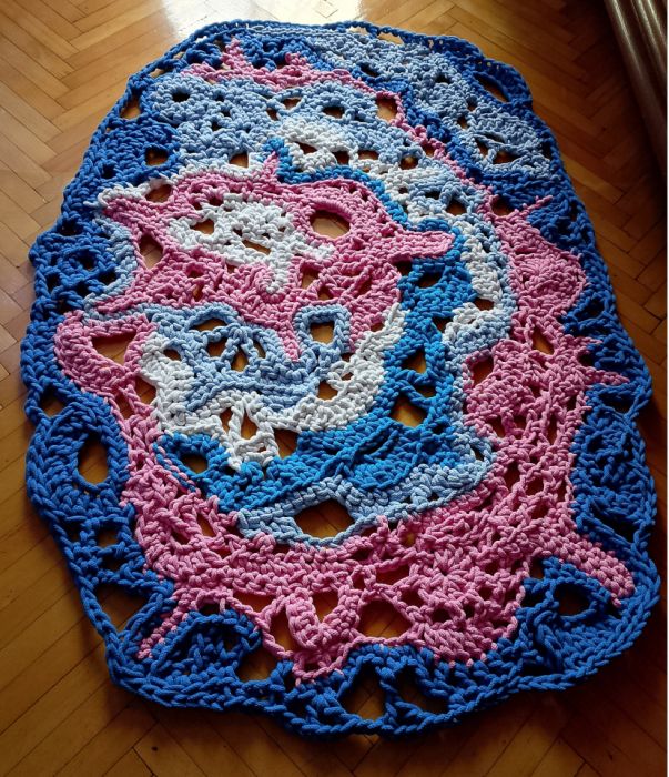Wyjątkowy dywan wykonany w całości ręcznie w formie kolorowej abstrakcji. Freeform crochet to technika tworzenia rękodzieła szydełkiem, która nie opiera się na żadnych wzorach czy schematach, pozwalając na całkowitą swobodę twórczą, łączenie różnych ściegów, kolorów i faktur w asymetryczne, unikalne formy. Polega na intuicyjnym dzierganiu i tworzeniu artystycznych kolorowych, organicznych kształtów.