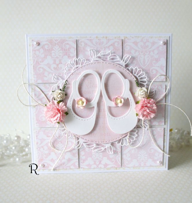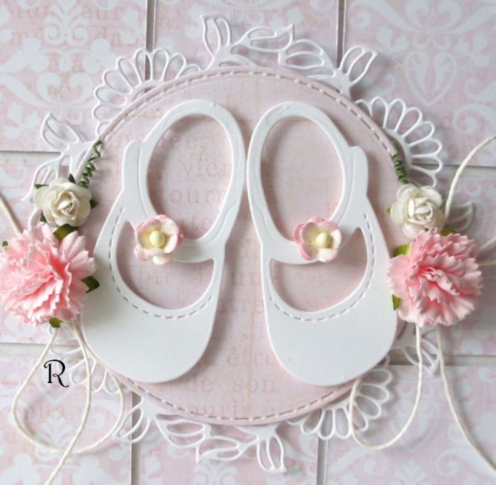 Bogato zdobiona: delikatnym, warstwowym motywem bucików, kwiatami. Kartka warstwowa, ozdobę stanowi element patchworku.