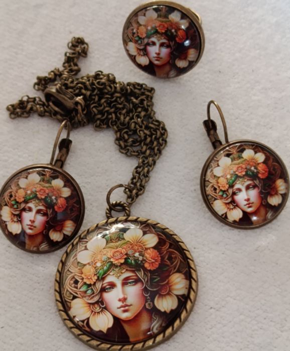Urocza, romantyczna - taka jest dziewczyna na szklanych kaboszonach użytych do wykonania tego kompletu. Kolorystyka utrzymana w ciepłych barwach, beżowych, pomarańczowych, brązowych z odrobiną zieleni. Oprawa w kolorze antycznego brązu tylko on tu pasuje.