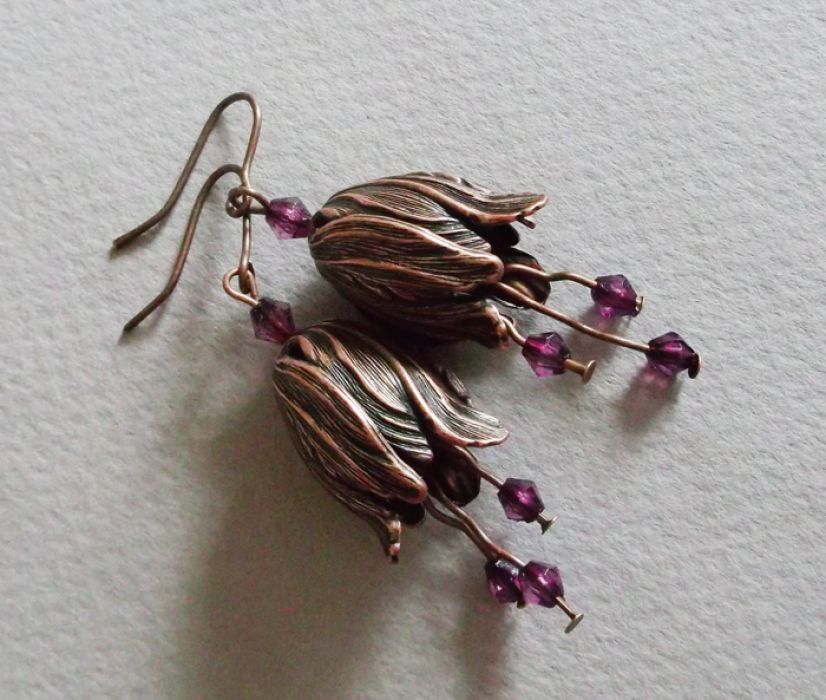 Duże, ładnie uformowane z miedzi dzwonki, ozdobione fioletowymi kryształkami i zawieszone na ręcznie formowanych biglach. Oryginalne. Delikatnie pobrzękują. Waga: 4,2 grama, długość: 5,7 cm. Wysyłam w ozdobnym pudełku. POLECAM!