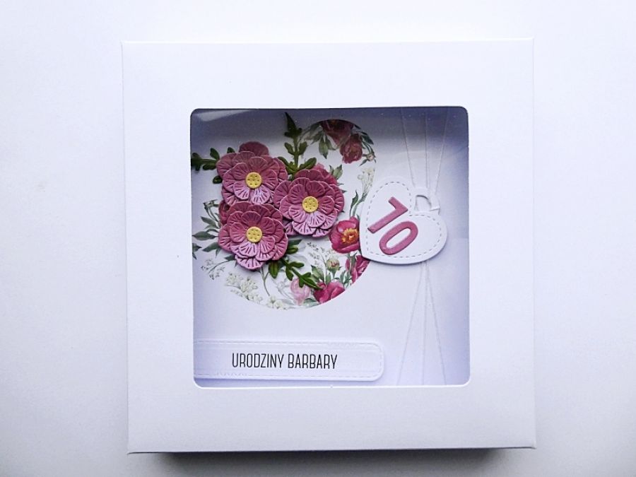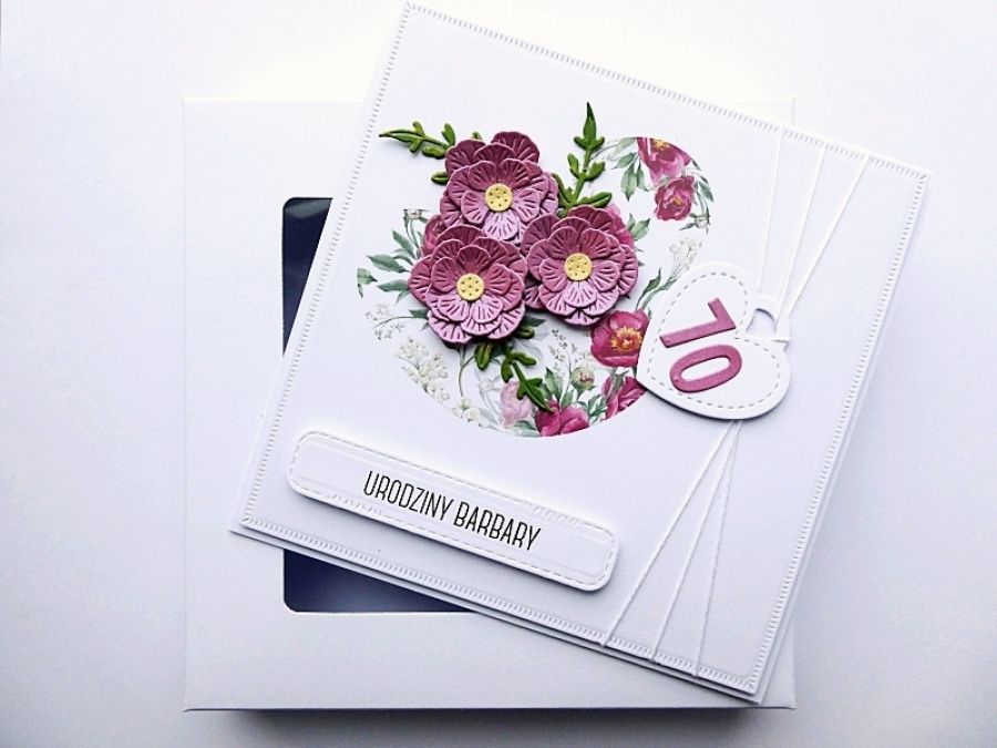 Ręcznie wykonana kartka urodzinowa w zestawie z dekoracyjnym pudełkiem z okienkiem.