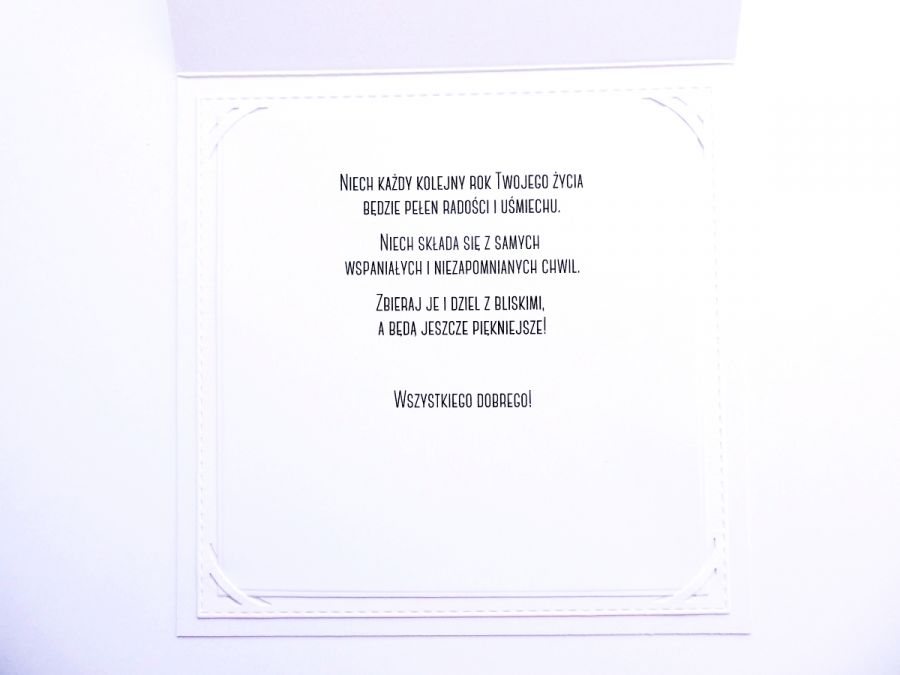 Kartka ma wklejony w środku biały karnecik, w którym umieszczona została wkładka z życzeniami.