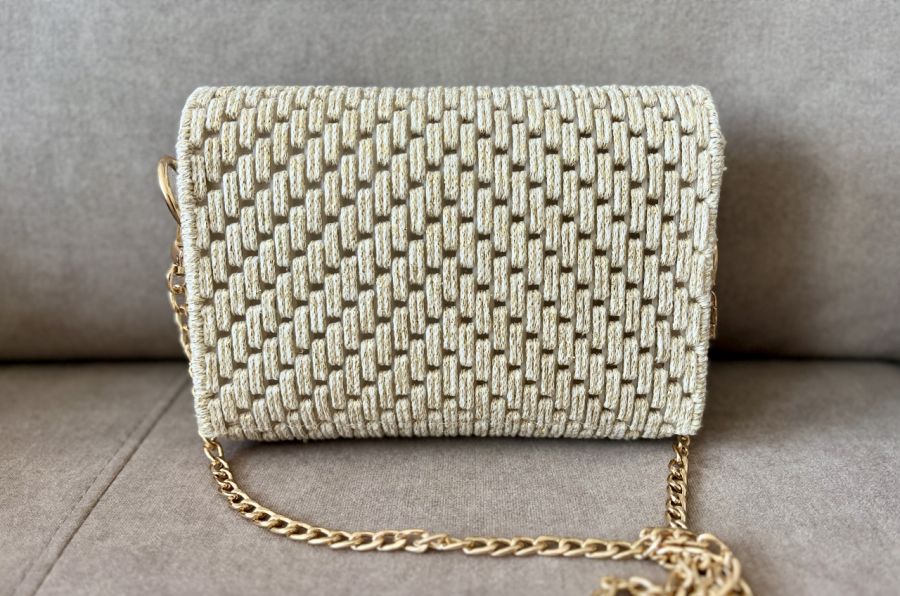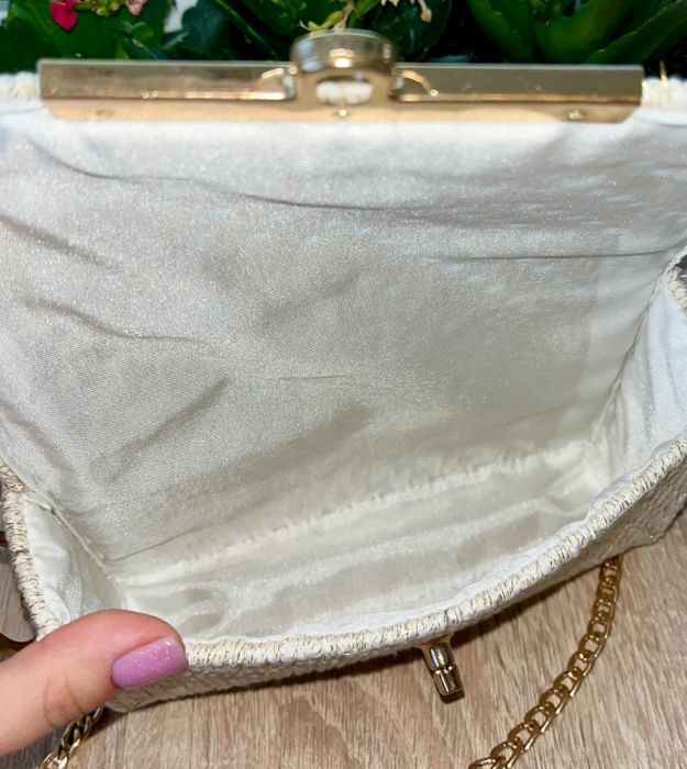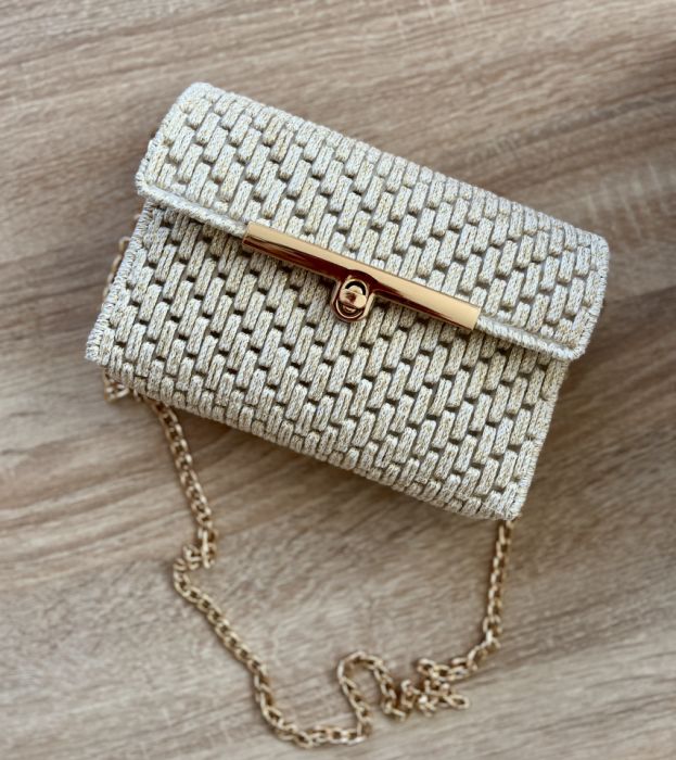 Torebka utrzymana jest w odcieniach ecru z dodatkiem złotych nici, a całość dopełnia stylowe zapięcie w kolorze złota oraz delikatny, złoty łańcuszek. Jej kompaktowy rozmiar sprawia, że pomieścisz najważniejsze drobiazgi: telefon, klucze, pomadkę i kartę płatniczą.