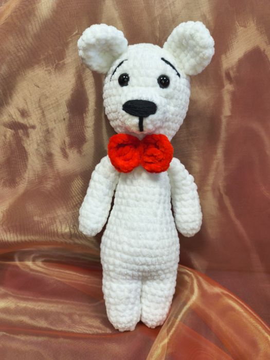 Uroczy miś pluszowy z czerwonym muchą, wykonany ręcznie na szydełku. Miękki, przyjemny w dotyku i dopracowany w każdym detalu. To wyjątkowa maskotka na prezent, która sprawdzi się na wiele okazji.