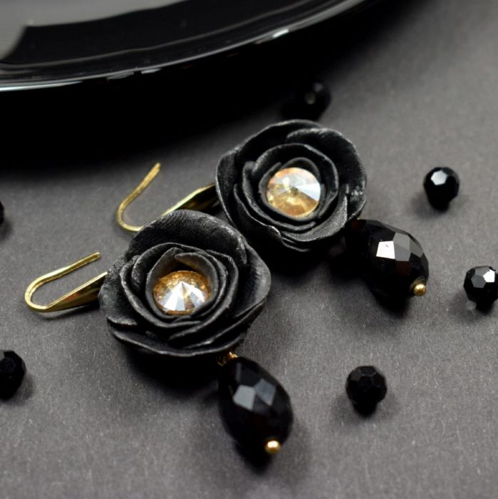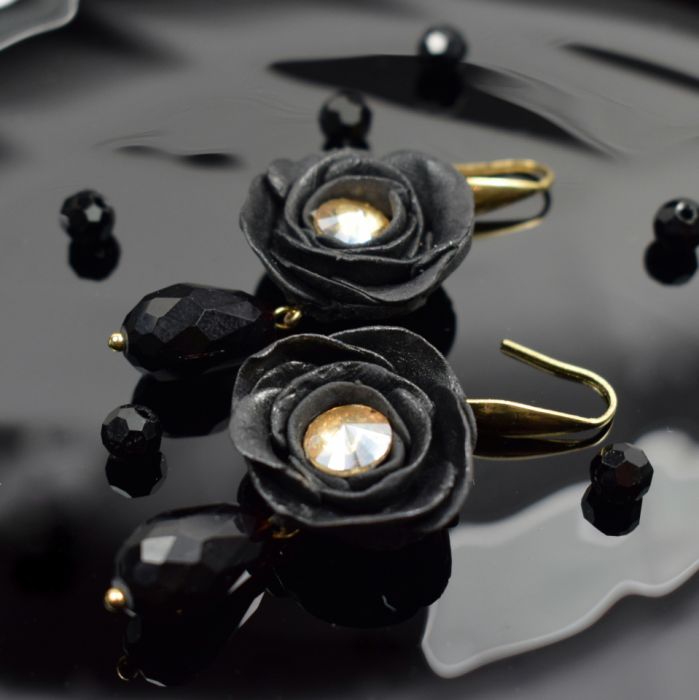 Nazwa produktu: Eleganckie kolczyki czarne kwiaty z kryształami
