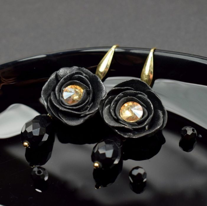 Eleganckie, ręcznie robione kolczyki, które łączą w sobie subtelność i wyjątkowy charakter. Delikatne kwiaty zostały uformowane z wysokiej jakości glinki polimerowej, a ich serce zdobi błyszczący kryształ w złotym odcieniu. Pod kwiatem zawieszona jest efektowna, czarna szklana kropla, która dodaje całości głębi i kontrastu.
