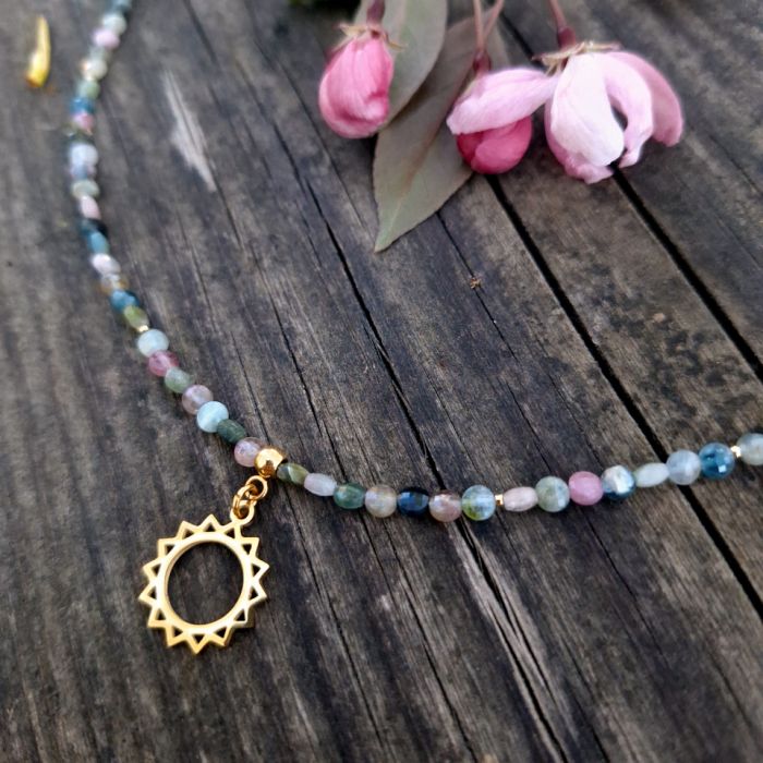 Wykonałam go z kolorowych turmalinów, które mają kształt małych (4 mm) pastylek - są lekko spłaszczone z dwóch stron, a do tego delikatnie fasetowane - odbijają subtelnie światło. Naszyjnik jest ze stali szlachetnej, pozłacany*.