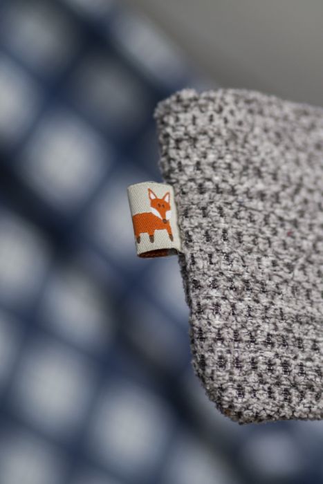Prosty portfel wykonany z szarej tkaniny o wyraźnym splocie.