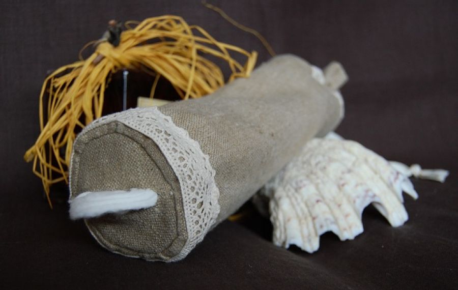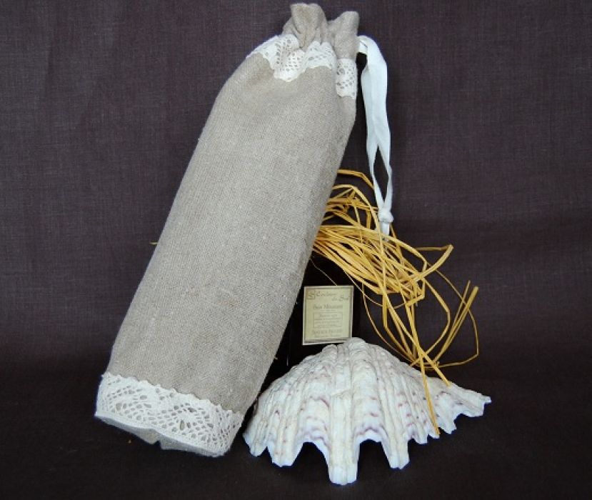 Etui na płatki kosmetyczne/waciki - uszyte z naturalnego lnu, ozdobione na dole i górze koronką bawełnianą. Podstawa (dół) etui ma formę koła z otworem na wyjmowanie wacików. Na górze wykończone tunelem, w który wciągnięta została tasiemka bawełniana. Całość utrzymana w naturalnej, rustykalnej stylistyce.