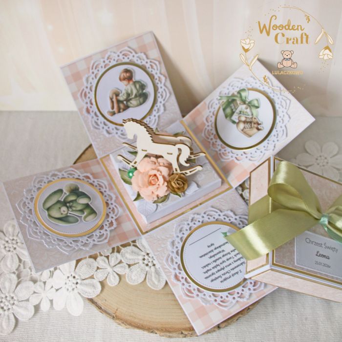 Przepiękna pamiątka chrztu świętego, roczku bądź narodzin, w formie exploding boxu utrzymanego w pięknych odcieniach brzoskwini, zgaszonej zieleni i bieli z dodatkiem złoych, błyszczących akcentów. Pudełeczko wykonane z mixu dziecięcych kolekcji papierów. Wieczko ozdobione zieloną kokardą oraz tagiem z imieniem dziecka i datą chrztu/narodzin/roczku - w zależności od okazji.
