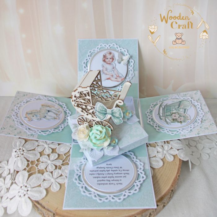 W środku boxa znajduje prześliczna tekturka 3D - ażurowy wózeczek, ozdobiony ręcznie robionymi kwiatami. Na ściankach boxa umieszczone zostały słodkie grafiki przedstawiające małą, uroczą dziewczynkę, jednorożca oraz dziecięcy fotelik, a także życzenia. Pod tekturką 3D znajduje się mini pudełeczko, do którego można włożyć prezent pieniężny.