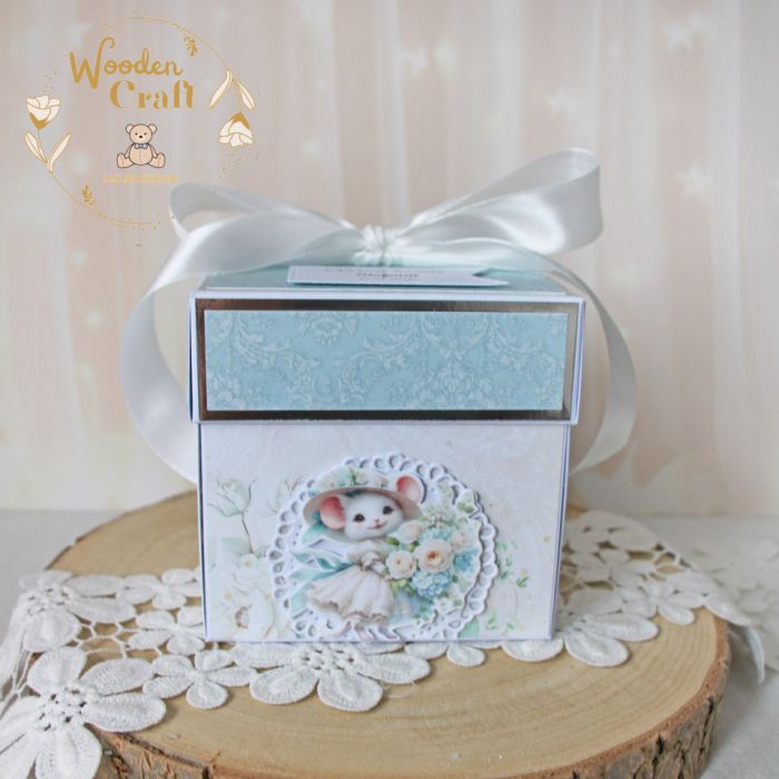 Przepiękna pamiątka chrztu świętego, roczku bądź narodzin, w formie exploding boxu utrzymanego w pięknych odcieniach mięty, beżu i bieli z dodatkiem srebrnych, błyszczących akcentów. Pudełeczko wykonane z mixu dziecięcych kolekcji papierów. Wieczko ozdobione białą kokardą oraz tagiem z imieniem dziecka i datą chrztu/narodzin/roczku - w zależności od okazji.