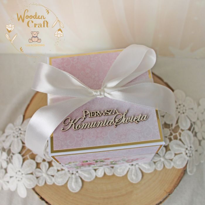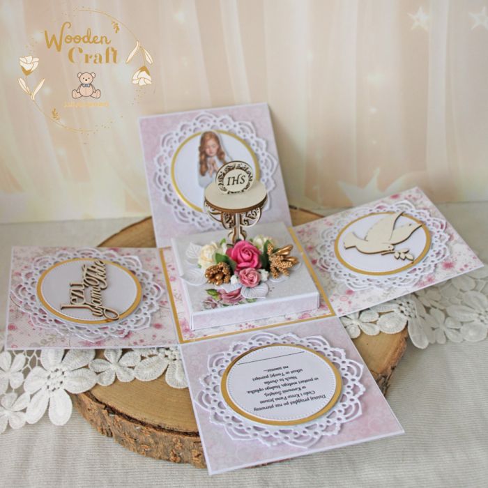 Piękna, elegancka pamiątka Pierwszej Komunii Świętej w postaci exploding boxu, wykonana ręcznie z najwyższą starannością, z cudownej kolekcji papierów "Pink Roses", utrzymana w odcieniach różu i bieli, z dodatkiem złotych, błyszczących akcentów. Na środku boxa umieszona została tekturka 3D kielich z hostią świętą, ozdobiony papierowymi. Na ściankach boxa znalazły się tekturki: cytat "Jezu ufam Tobie", gołębica oraz grafika modlącej się dziewczynki komunijnej, a także życzenia. Pod tekturką 3D umieszczone zostało mini pudełeczko, do którego można włożyć prezent pieniężny.
