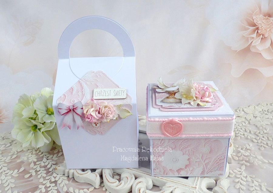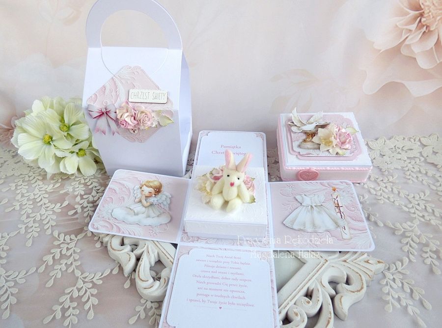 Pamiątka z okazji Chrztu Świętego w formie rozkładanego pudełka - exploding box w udekorowanej torebce.