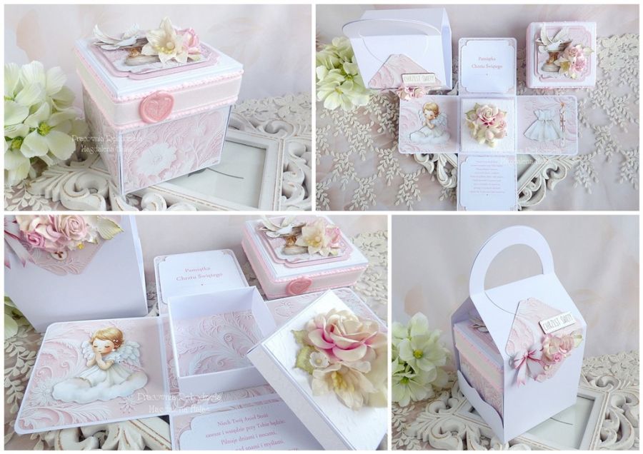 Komplet ozdobiony jest ślicznymi papierami scrapowymi i tłoczonymi polskich producentów, grafikami, uroczym króliczkiem, kwiatami oraz pudełkiem z wieczkiem na pieniądze lub drobny prezent o wymiarach 8x8x3 cm.