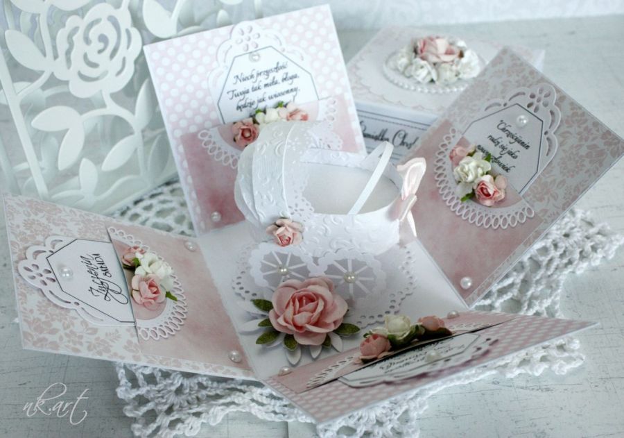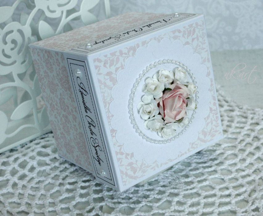 Pamiątka z wykorzystaniem czterech ścianek pudełka na piękne życzenia oraz inne ozdoby.