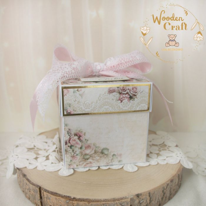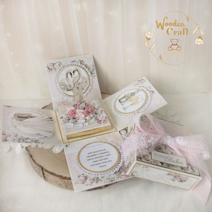 Przepiękny, romantyczny exploding box ślubny, utrzymany w odcieniach beżu, delikatnego różu i bieli z dodatkiem złotych błyszczących akcentów. Box wykonany z dbałością o każdy detal, z przepięknej kolekcji papierów "Today". Wieczko ozdobione koronkową kokardą oraz napisem "W Dniu Ślubu". W środku znajduje się prześliczna tekturka 3D Para Młoda ozdobiona kompozycją z papierowych kwiatów, a pod nią umieszczone zostało mini pudełeczko do którego można włożyć prezent pieniężny. Na ściankach boxa znalazły się grafiki pary łabędzi, sukni ślubnej i garnituru, a także kieliszków i szampana oraz życzenia.