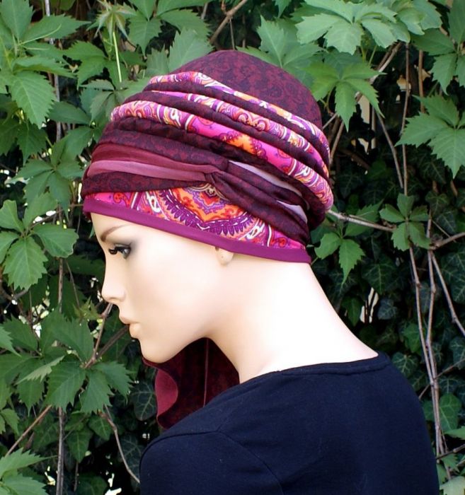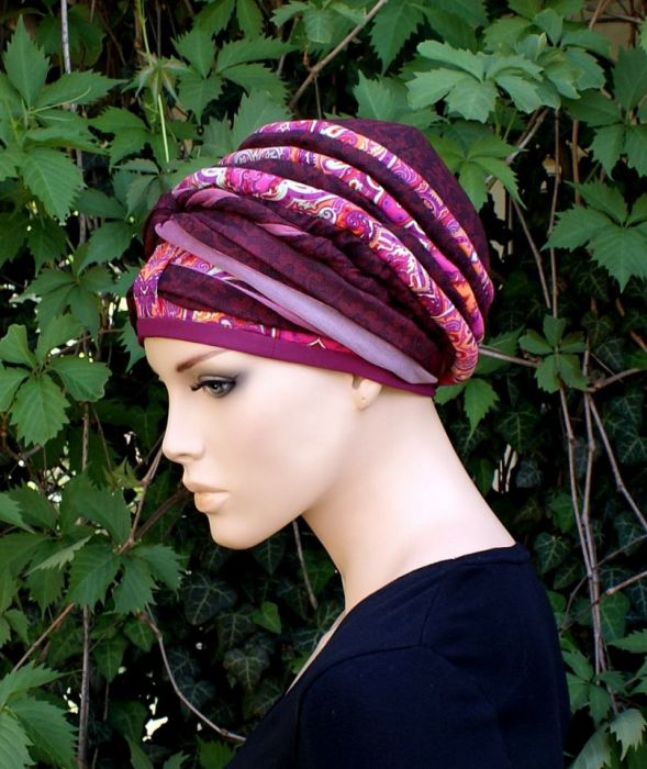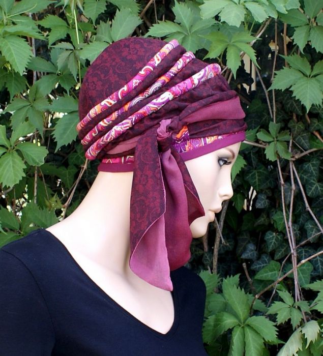Lekki turban uszyty z cieniutkich materiałów, na delikatnej podszewce z batystu. Połączenie różnych gatunków tkanin. Doskonałe nakrycie głowy na dzień i wieczór, plażę w kurorcie, centrum wielkiego miasta lub do ogródka... WYJŚCIE AWARYJNE jeśli zabrakło wody w kranie albo nie zdążyłaś zadbać o fryzurę. Ucieczka od peruki dla kobiet po chemioterapii. Lekki, przewiewny, w uniwersalnym rozmiarze, z możliwością różnych wariantów zamotania mobilnej szarfy (można nosić jak czapkę, bez szarfy przewleczonej przez szlufkę z tyłu). Specjalna konstrukcja pozwala zachować właściwą formę po praniu.