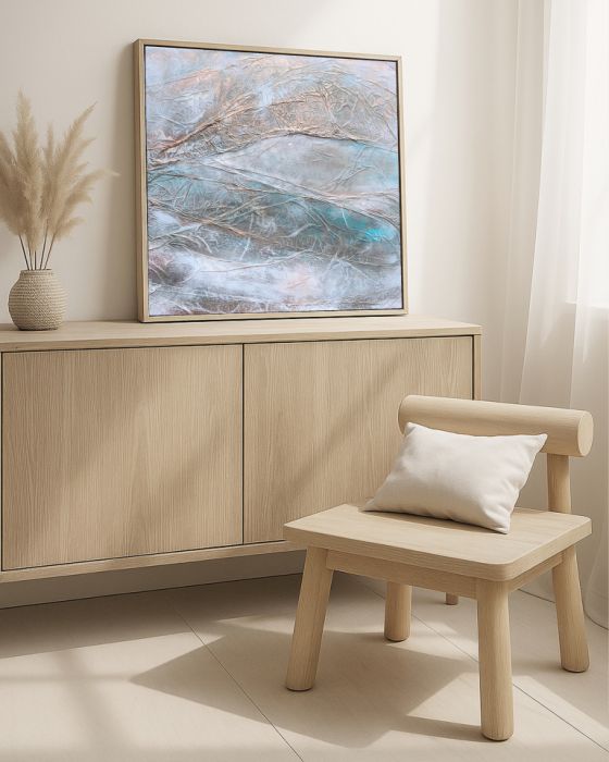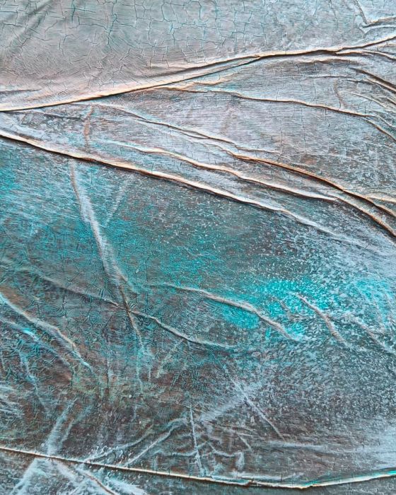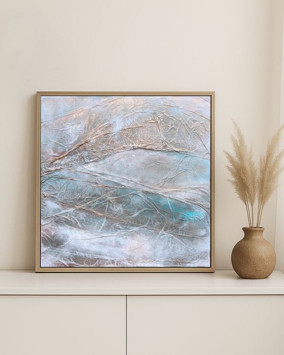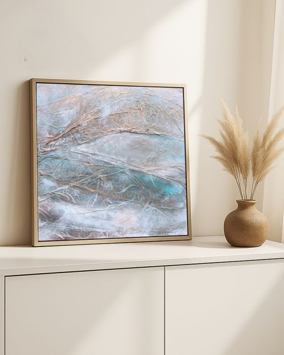 ✦ Technika: Mixed media (akryl, tusz akrylowy, folia aluminiowa, pasta strukturalna, naturalne pigmenty ziemne) na płótnie bawełnianym (380 g/m²)