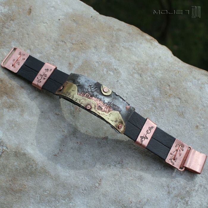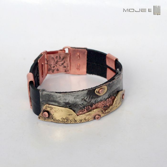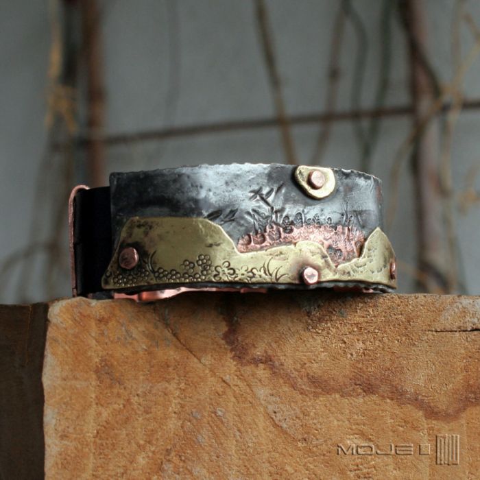 Bransoletka z miedzi, mosiądzu i skórzanych rzemieni - stylizowany górski pejzaż. Zrobiłam ją z miedzi częściowo pokrytej cyną, a także mosiądzu i czystej miedzi. Faktura nadana jest za pomocą młotkowania oraz stempli. Metal jest patynowany i przecierany dla wydobycia wzorów i faktury. Bazą są skórzane czarne płaskie rzemienie.