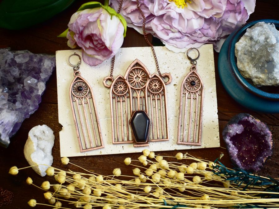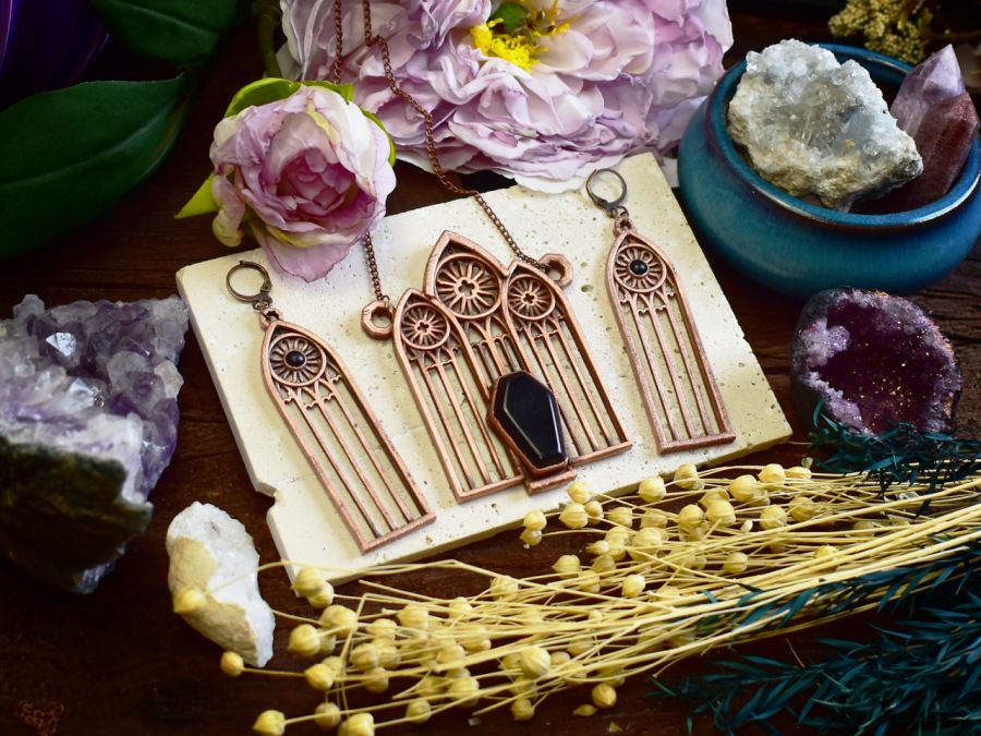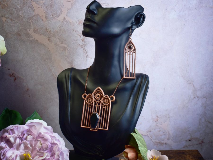 Elegancki zestaw biżuterii z czarnym onyksem, stworzony metodą elektroformowania z miedzi. Kolczyki i wisiorek inspirowane stylem gotyckim i wiktoriańskim oraz architekturą, pełne drobnych detali. Idealny prezent dla niej, doskonały wybór na urodziny, rocznice lub wyjątkową okazję. Każdy element jest unikalny, ręcznie robiony, co czyni go idealnym wyborem dla miłośników mrocznej, eleganckiej biżuterii.