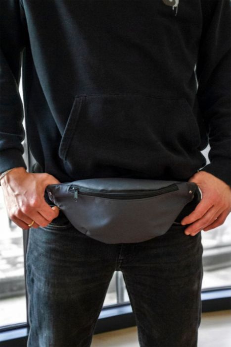 Duża nerka saszetka biodrowa w kolorze grafitowym.