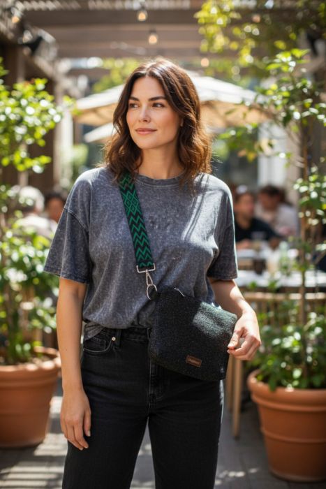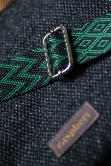 Torebka posiada regulowany, zielono-czarny pasek w zygzaki i srebrne okucia.
