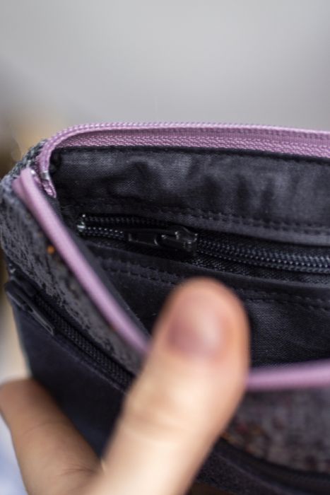 Idealny na karty płatnicze oraz pieniądze. Zapinany na suwak, z przodu kieszonka na drobne, w środku bawełniana podszewka i kieszonka na suwak.